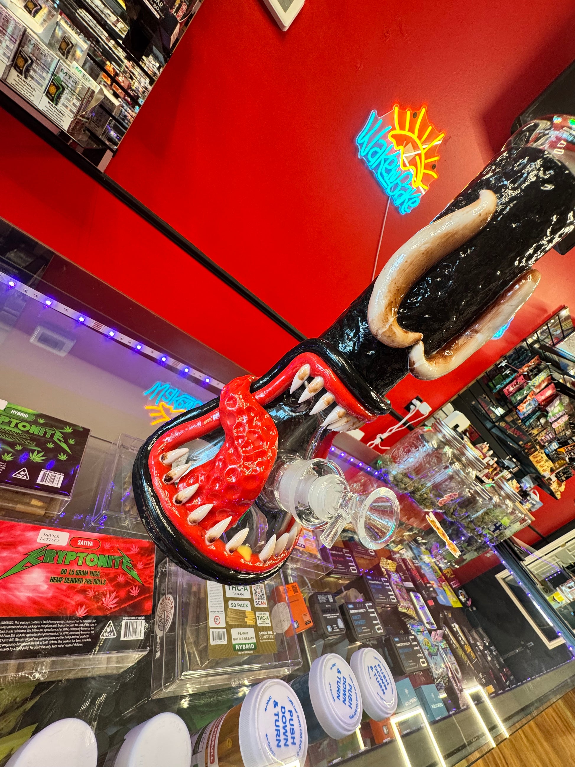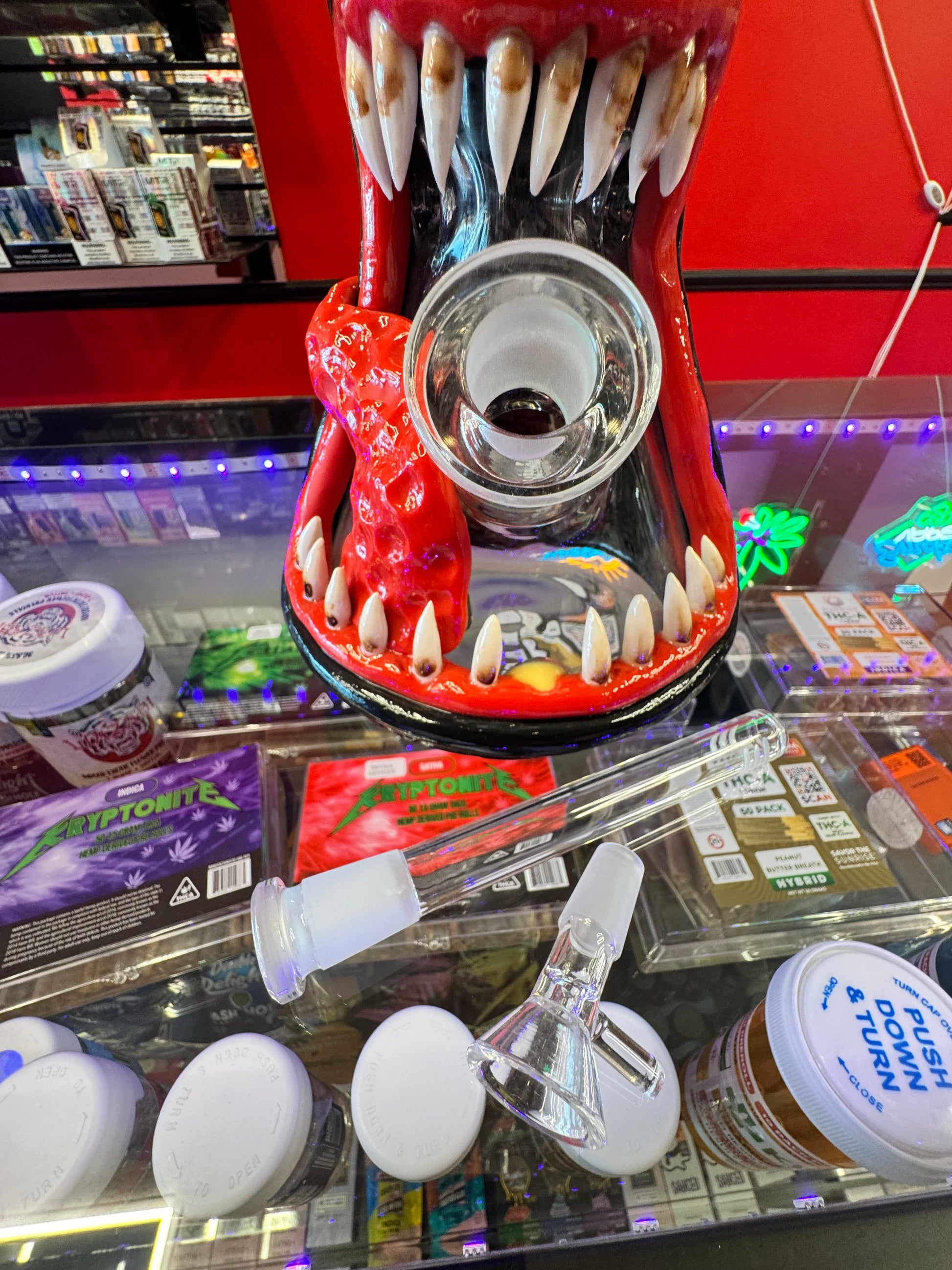 The Venomous Carver Glass is more than just an accessory; it is a meticulously detailed work of art. Featuring a striking deep-black textured body contrasted by a vibrant, hand-sculpted red monster mouth with realistic tusks, this piece is designed to be the centerpiece of any collection.